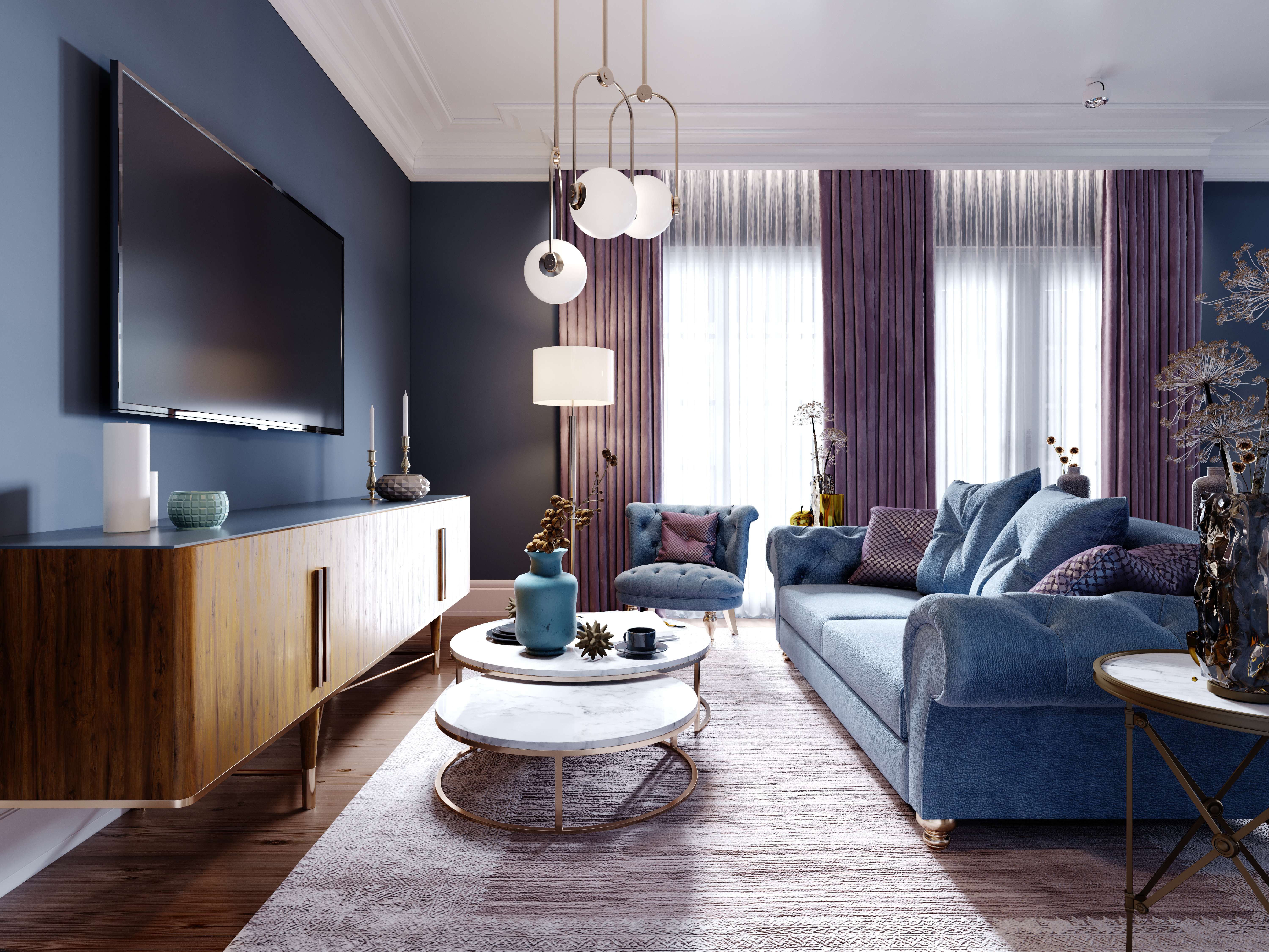 Стенки больше не в моде. Сейчас преобладают отдельные предметы мебели, которые нужно расставить так, чтобы пространство оставалось просторным, но в то же время удобным и функциональным. Важнейшим элементом интерьера является тумба под телевизор и сам телевизор, и даже если телевизор висит на стене, тумба необходима, например: для DVD-дисков или игровой приставки. Также в гостиной необходим диван, кресло или приставной уголок - именно на них мы проводим большую часть времени в кругу семьи, поэтому важно, чтобы они были подобраны в правильном цвете, стиле и покрое. Лучше всего выбирать диваны и кресла в цветах, сочетающихся со всем интерьером, не очень контрастных. Идеальными вариантами станут скандинавский или ретро-стиль.