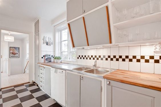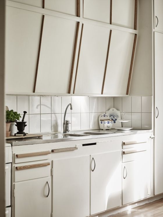 Характерной частью классических скандинавских кухонь являются навесные шкафы, вырезанные под углом. Их уникальность можно сравнить с выдвижной скамьей. Они присутствовали в каждом доме. Одни их обожали, а другие отворачивали взгляд с кислым лицом. Их самый большой недостаток является их самым большим преимуществом. Из-за вертикального среза, наклон передней части к пользователю, они легко открывались, не ударяя при этом головой, они увеличивали площадь свободного доступа. Разумеется, при всем этом они имеют меньшую складскую площадь и в сочетании с раздвижной дверью иногда вызывают непреднамеренное падение вещей.
